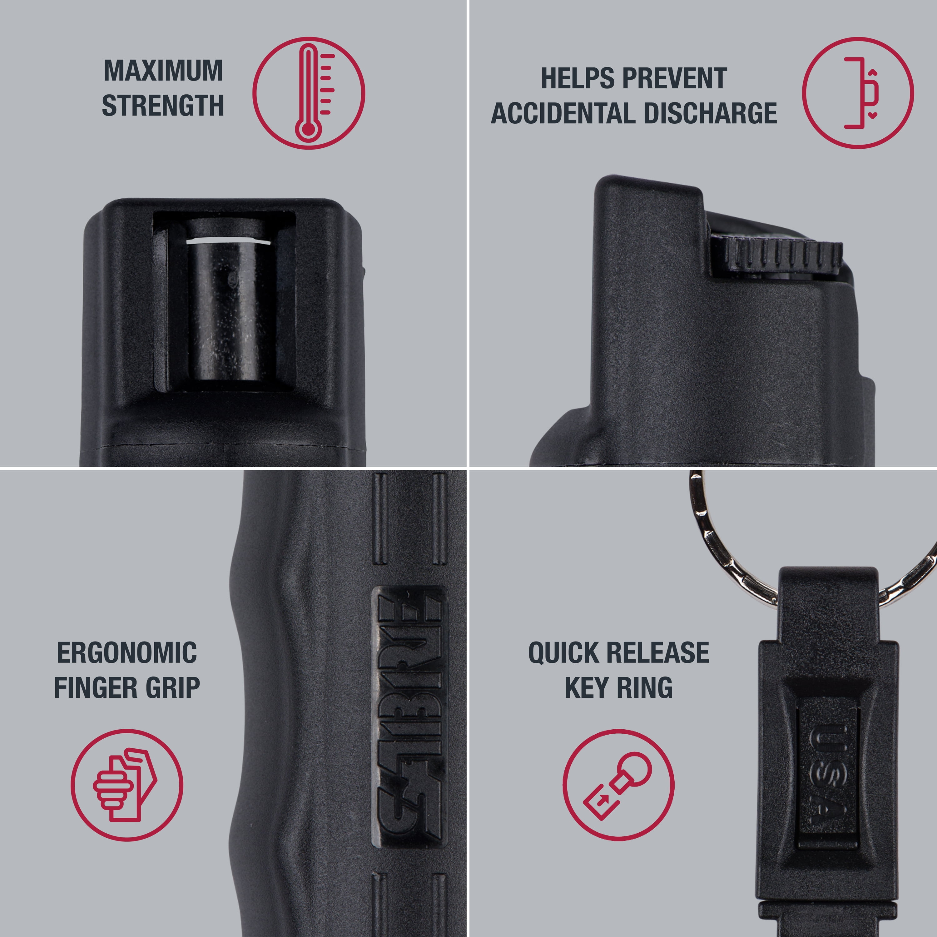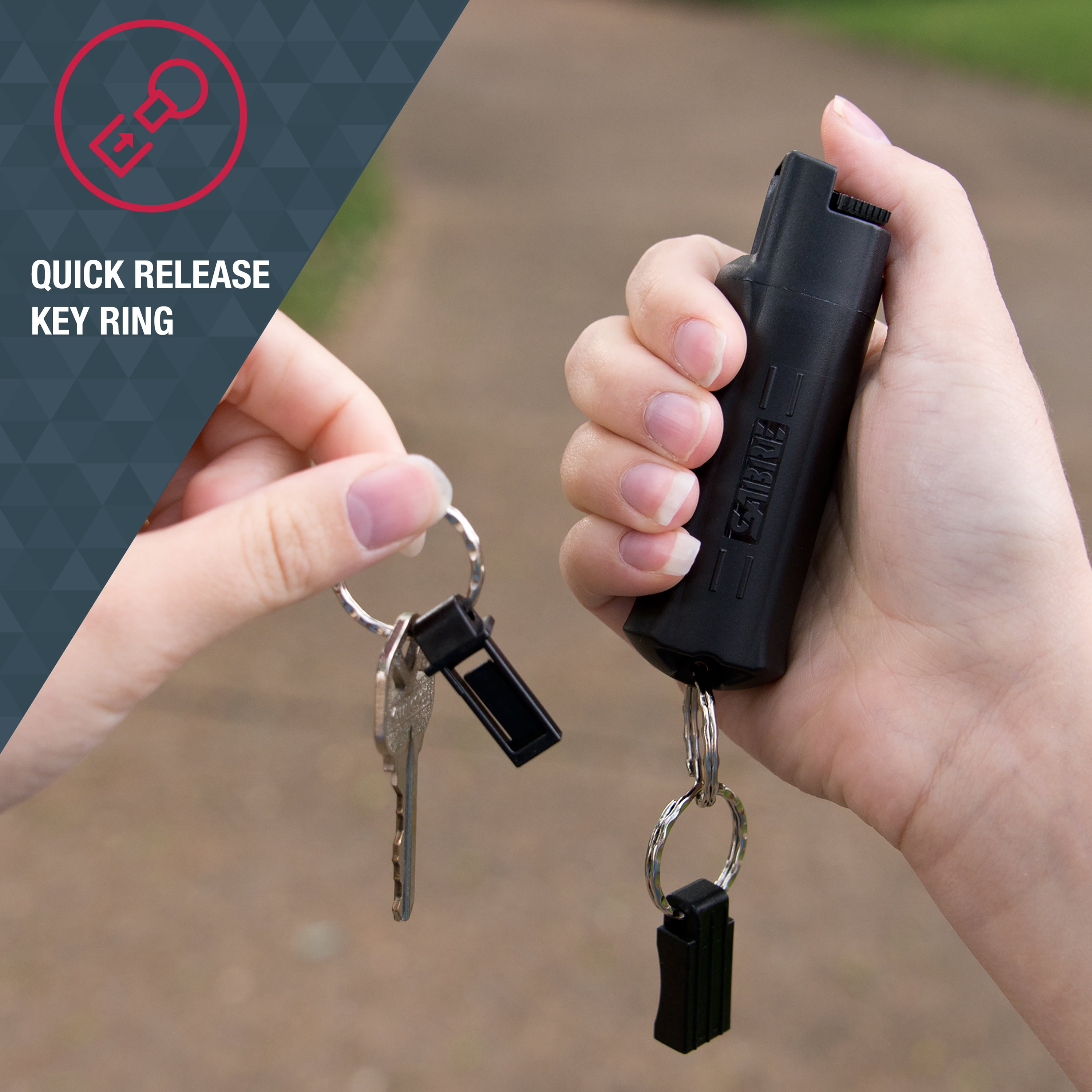 Quick Release Key Ring. The intuitive grip design allows for better aim and proper hand alignment with touch alone allowing for faster deployment and helping you to keep your eyes on the threat. Sabre 3-in-1 Pepper Spray.